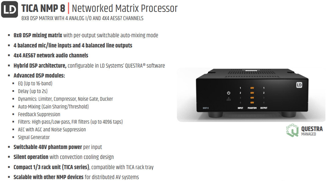 The NMP 8 is a compact 8x8 DSP matrix processor and part of the TICA® Series. It is designed to route, mix and optimise audio across installed, multi-zone AV systems. It has 4 balanced mic/line inputs featuring switchable 48 V phantom power per input, as well as 4 balanced line outputs. This allows it to connect local microphones, media sources, amplifiers and powered speakers in a clean, streamlined setup.