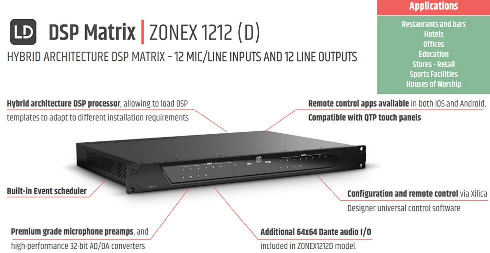 From routing and processing of different microphone and speaker groups, in a church for example, to complex multi-room installations with calendar-managed routing for different configurations - the ZONE X 1212 D makes everything possible.