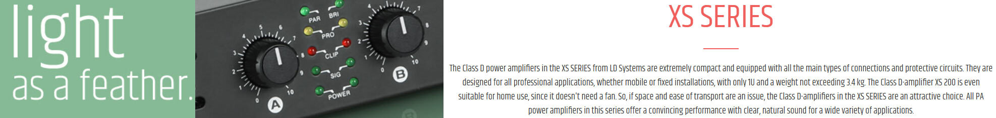 RRP A$704.71A$599.00LD Systems XS700 Power Amplifier The XS700 is the flagship of the XS series of power amplifiers and an absolute flyweight with just 1U and 3.4kg. Our Class D power amplifier technology makes it possible to pack high performance into a minimum of space...